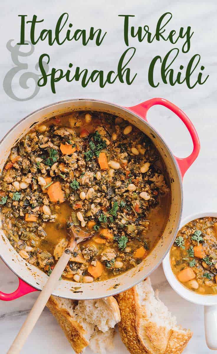 Need a delicious, warm, and healthy meal to meal to feed a large group? Look no further! This Italian Turkey and Spinach Chili is super flavorful and makes a ton. The use of ground turkey makes it a healthy alternative to beef chili.