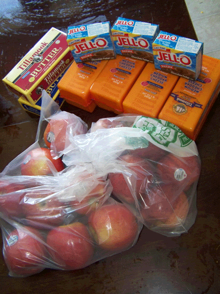 Then at Fred Meyers I purchased 4 Tillamook cheese, 2 butter, 3 Jello puddings, and some apples. I am probably going to go back this week and stock up on more butter and cheese.